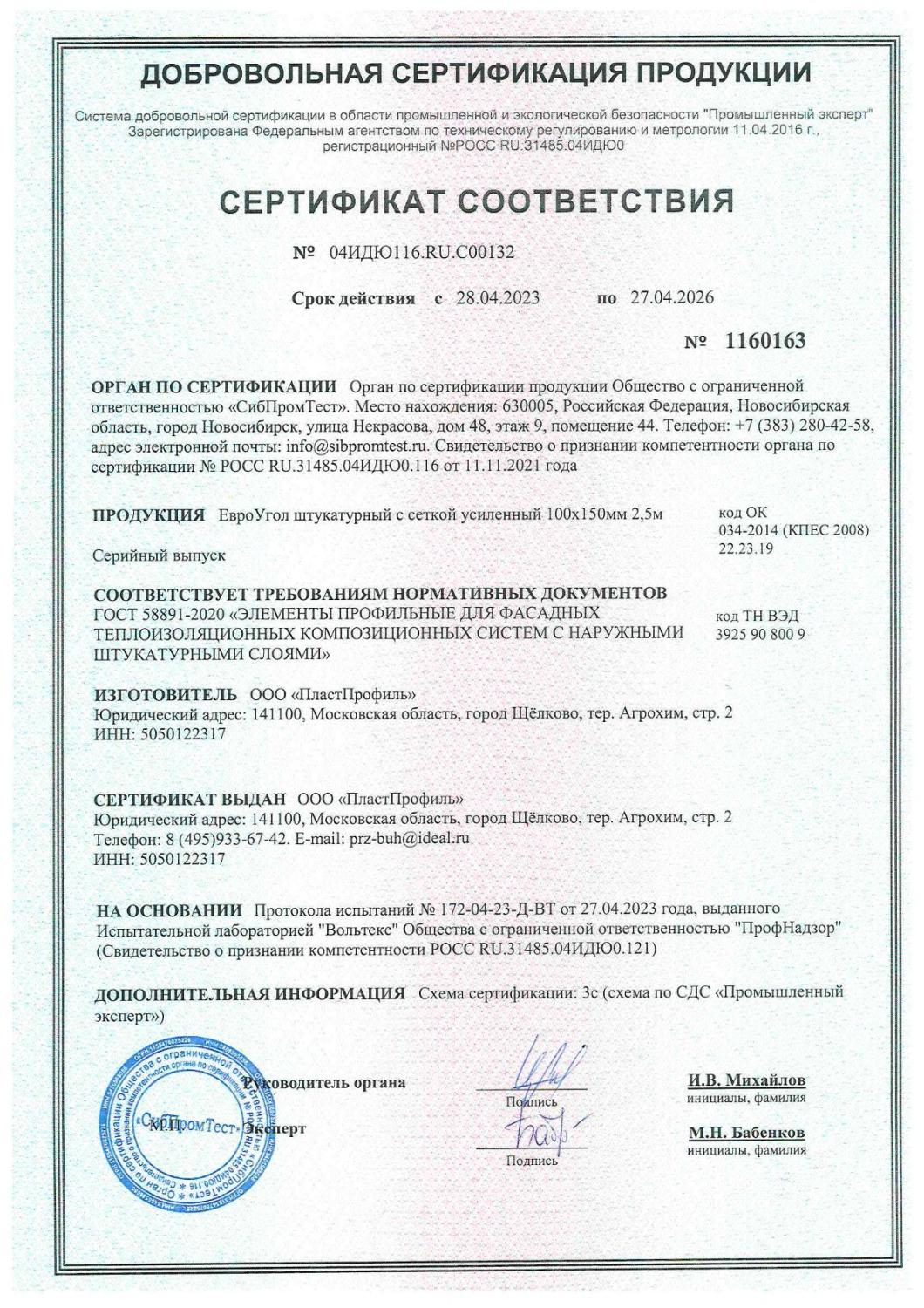 ЕвроУгол штукатурный с сеткой усиленной. Сертификат соответствия ГОСТ 58891-2020