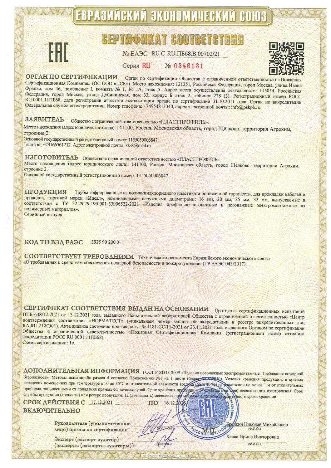 Трубы гофрированные ПВХ с зондом. Сертификат соответствия ТР ЕАЭС 043-2017
